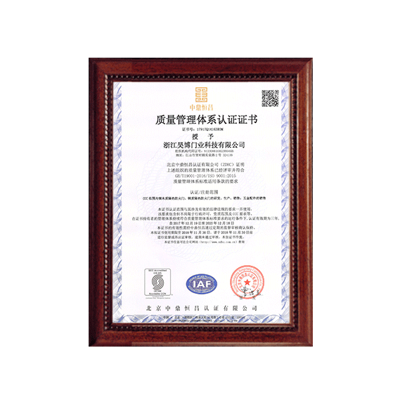 公司一直以來嚴(yán)格執(zhí)行ISO9001質(zhì)量體系和ISO14001環(huán)境管理體系標(biāo)準(zhǔn),建立了完備的科研、開發(fā)、生產(chǎn)、銷售服務(wù)體系。公司是浙江省門業(yè)協(xié)會會員單位,江山門業(yè)協(xié)會理事單位,中國木材與木制品流通協(xié)會會員單位,江山市消防協(xié)會副會長單位。